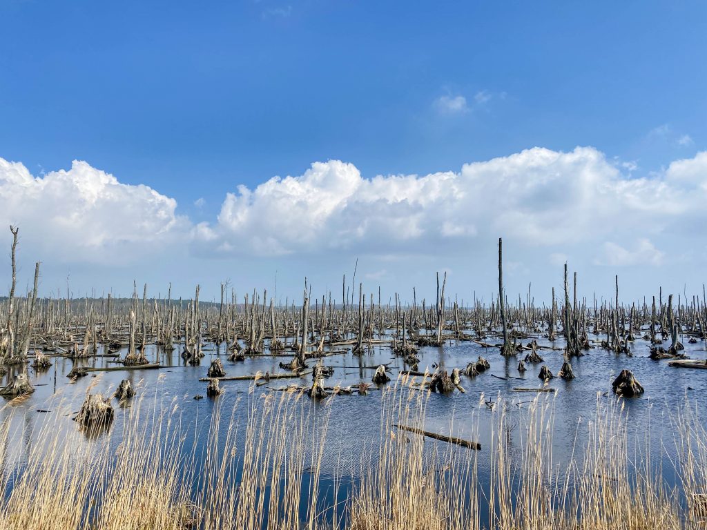 Nach fünf Stunden Autofahrt bot sich uns noch vor der Wolgaster Brücke – dem blauen Wunder- eine bizarre Landschaft. Kurz hinter Pinnow ragen abgestorbene Bäume aus dem Peenestrom. Im Internet hab ich gelesen, dass es sich hierbei um Überflutungsgebiete bzw. Ausgleichsflächen handelt.