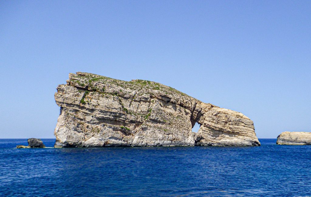 Am dritten Urlaubstag wurde es Zeit für einen ersten Ausflug. Bei dem örtlichen Anbieter Fernández Cruise buchten wir eine Fahrt zum Dwejra Point und zur Blue Lagoon. Wir waren etwas verwundert, dass die Tour nur an drei Tagen in der Woche angeboten wird. Begründet wurde uns das, dass man so die Natur schützen wolle. Das klang zunächst logisch und traf auf unser Verständnis. An den anderen Tagen kann man dagegen für einen heftigen Aufpreis auch eine Privattour mit einem kleineren Boot buchen. Die Fahrt mit dem zweimastigen Boot, auch Turkish Gulet genannt, führte uns an der Küste der Insel Gozo zu der eindrucksvollen Felsformation „Azure Window“ vor Dwejra. Durch Wind und Wellen wurde dieses riesige Felsentor geschaffen. Leider holte es sich die Natur auch wieder zurück. Bei einem schweren Sturm im März 2017 stürzte das etwa 100 Meter lange und 20 Meter hohe Fenster vollständig ein.